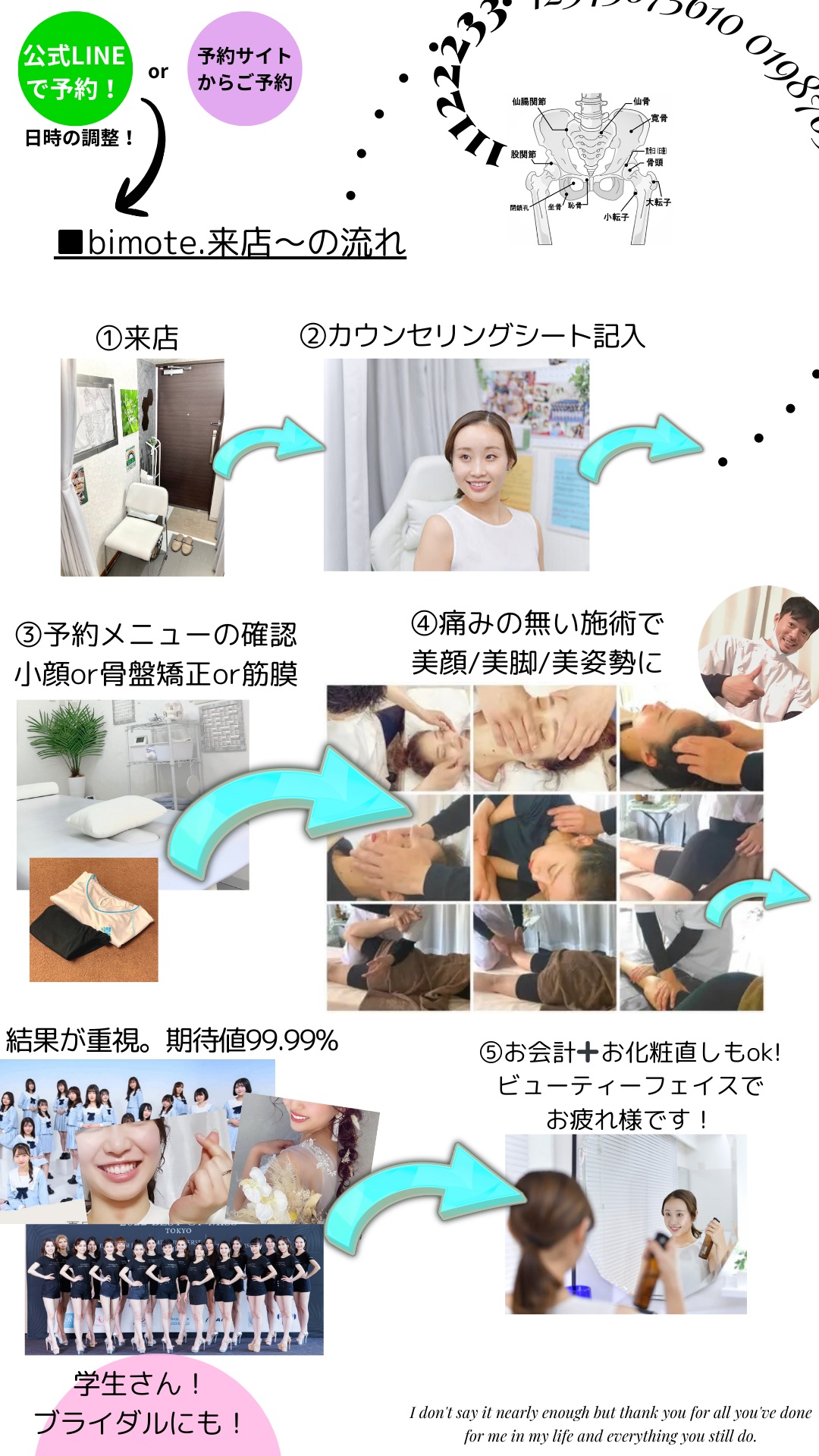 bimote.の美容矯正=骨格を整える 頭蓋骨、骨盤、脊柱、肩甲骨、足、関節や靭帯などの骨格から歪みを、筋肉の調整と共に整えます。 繰り返さない様に【根本改善】をするの事を目的としています。